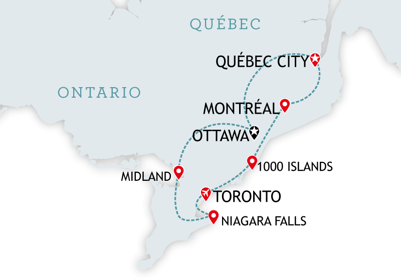 Following the shore of the St. Lawrence, travel west past Montreal, across the Ontario border to Ottawa — the nation’s capital city. Explore with a City tour. Overnight in Ottawa.
