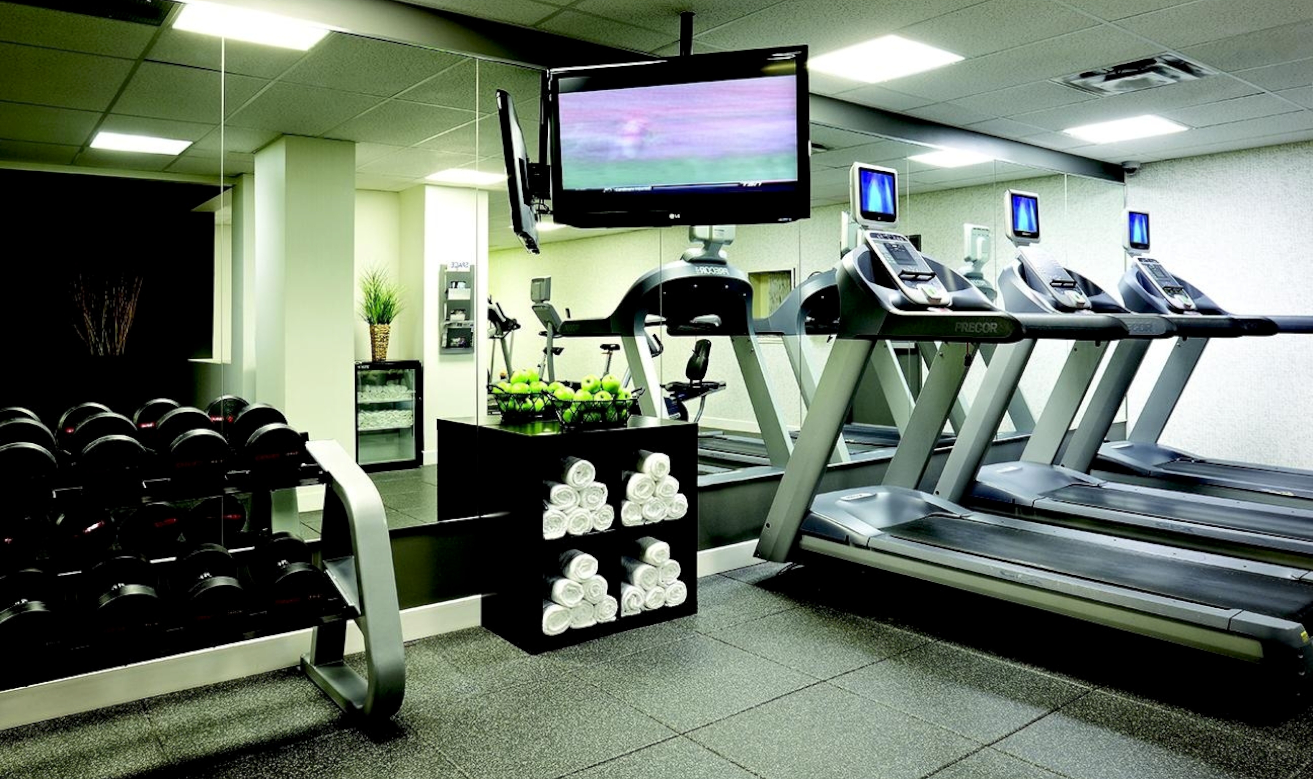 The fitness centre includes an exercise room and indoor pool, as well as a sauna.